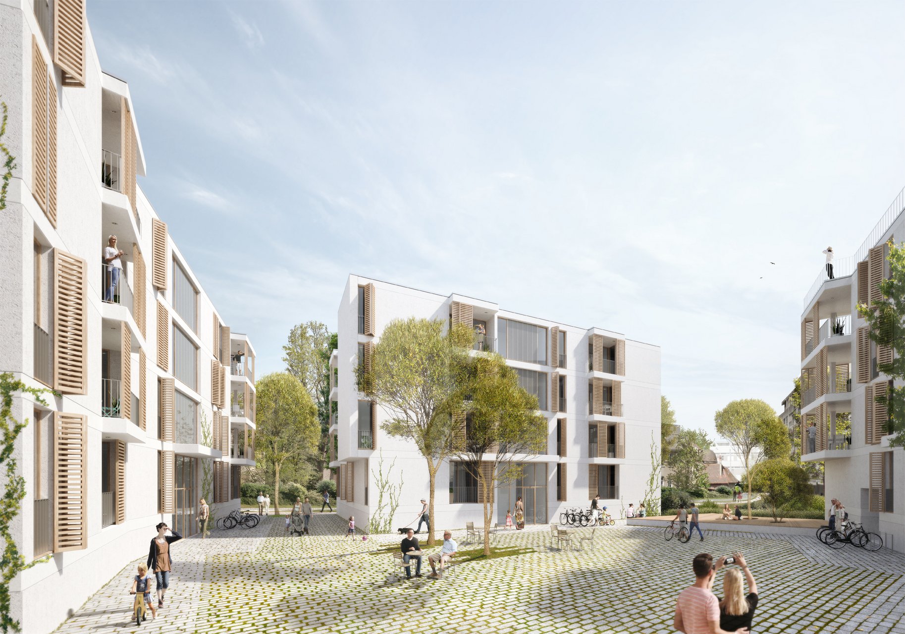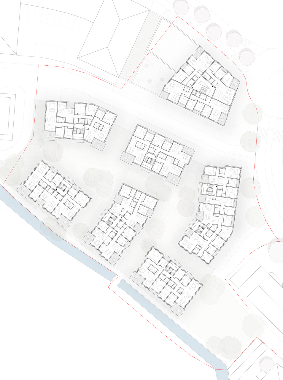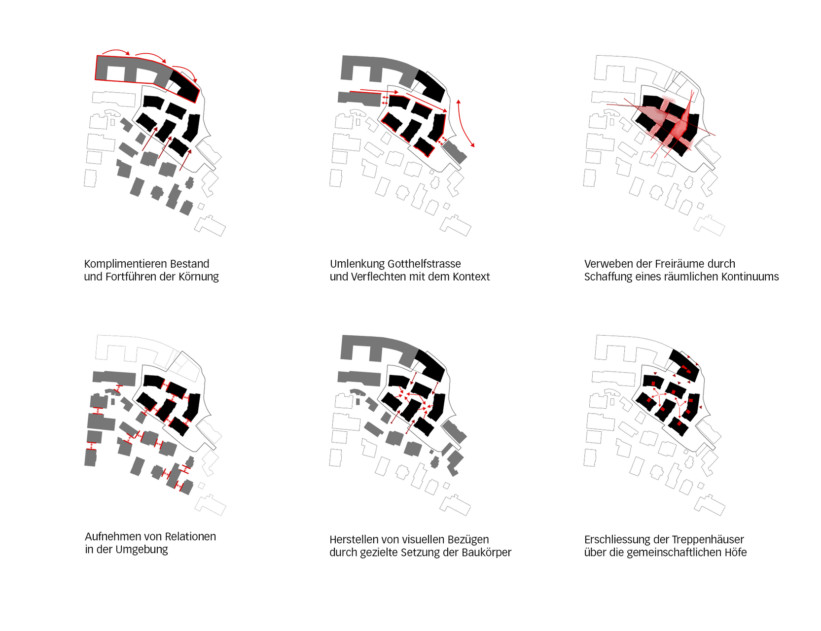 Mit ihren Stellungen und ihren Formen spannen die Gebäude zwei verschiedene, in ihren Ausmassen aber gleichwertige Höfe auf; im Westen ost-west-orientiert, im Osten nord-süd-gerichtet. Öffnungen in der Verlängerung aller vier Raumkanten verweben diese Hofräume untereinander und mit dem, das Areal umgebenden öffentlichen Raum. Diese verbindenden Aussenräume lehnen sich in ihrer Breite an viele, in der unmittelbaren Umgebung vorkommenden Räume an. Die Öffnung des Hofs im Westen schafft– eine weitere räumliche Verknüpfung der neuen Bebauung mit dem westlichen Bereich des Mülibachs. Im Ergebnis entsteht ein abwechslungsreiches Raumkontinuum von unterschiedlichen, miteinander verbundenen Freiräumen, mal gross, mal klein, mal eng, mal weit.