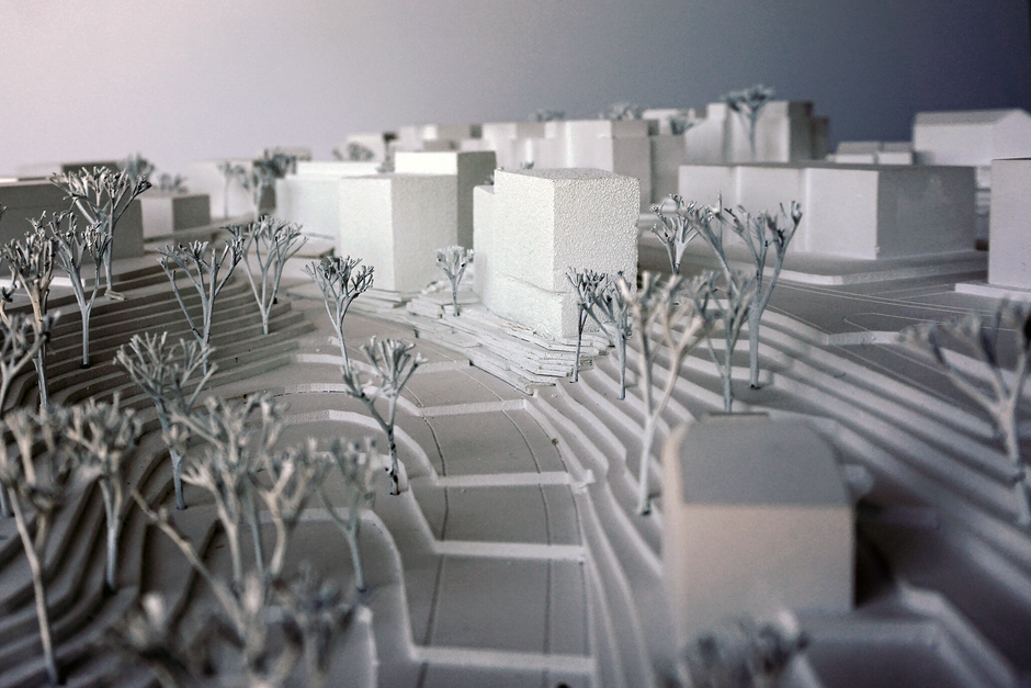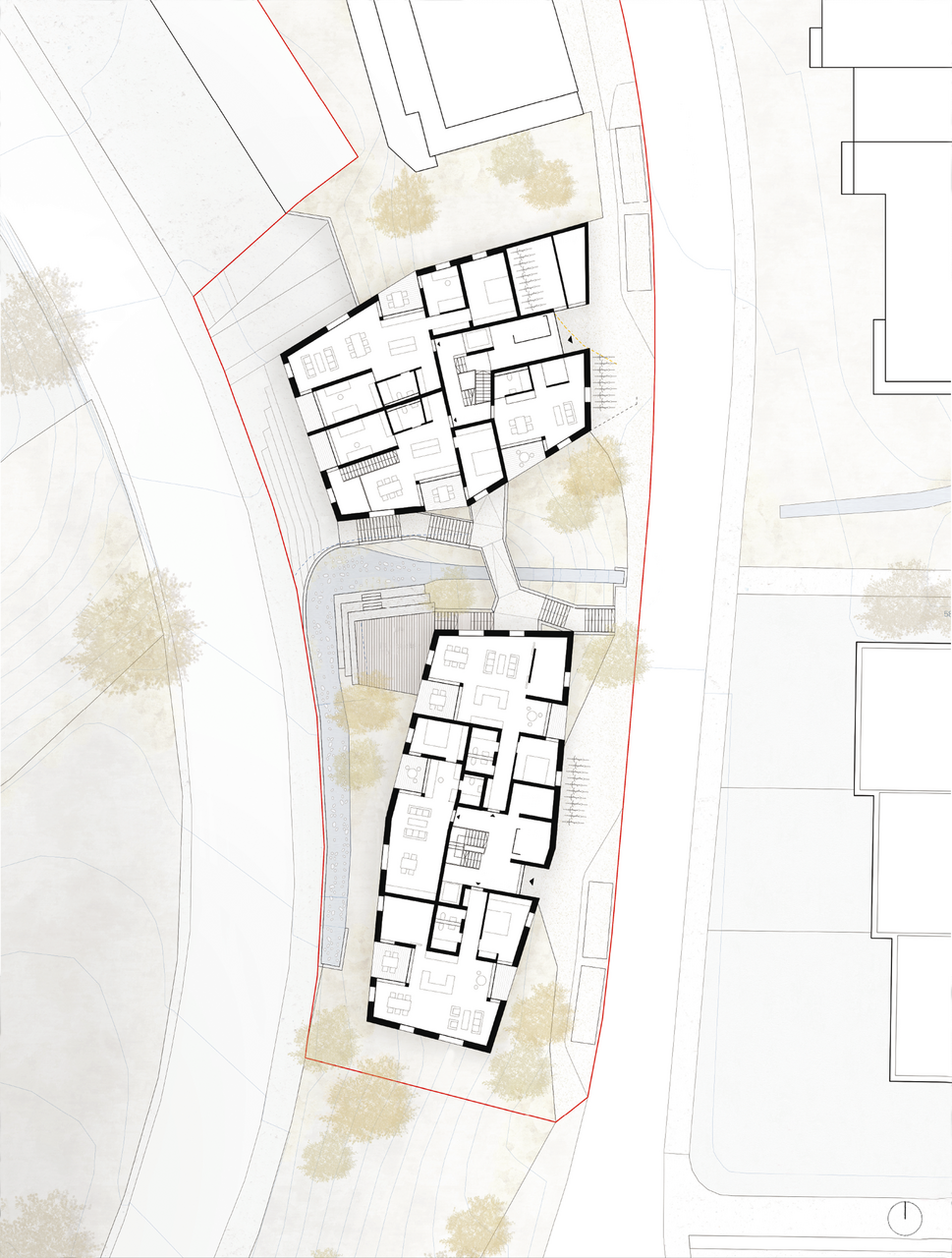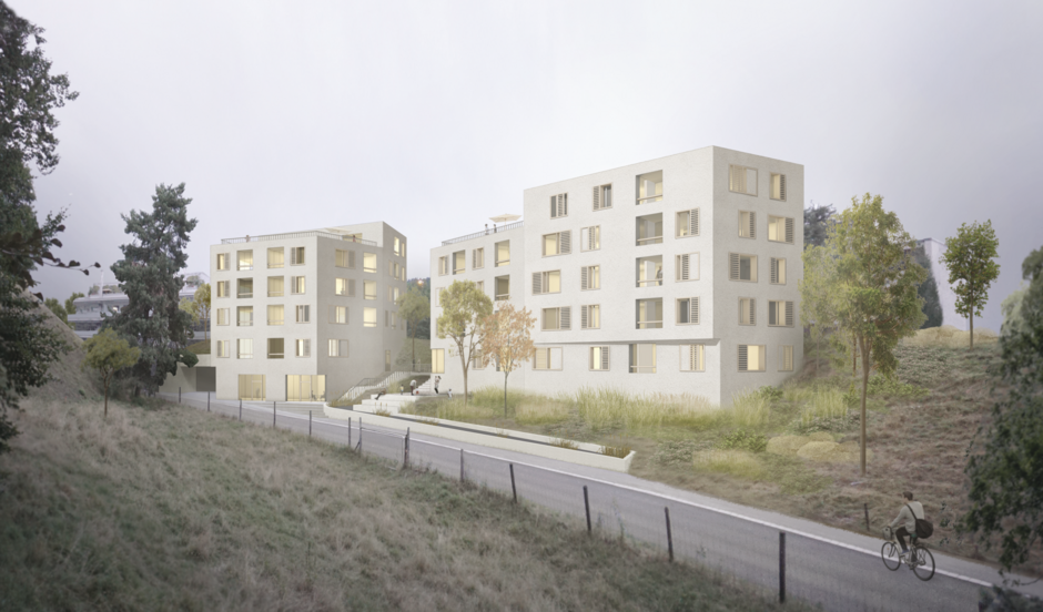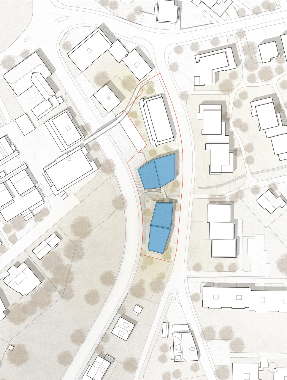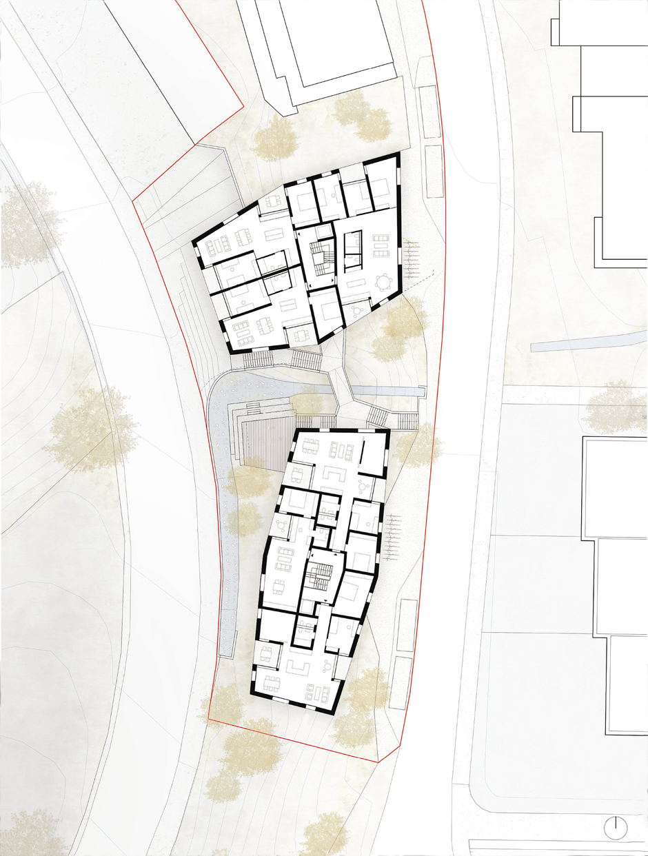 Vorgeschlagen werden zwei Volumen in der Grundform von unregelmässigen Sechsecken. Mit ihren Dimensionen, insbesondere den Fassadenlängen vermitteln sie zwischen den umliegenden Strukturen. Dabei steht das südliche Volumen längs, das nördliche Volumen quer zur Bolligenstrasse. Das südliche Haus liegt, wie die im Süden folgenden Punktbauten, im Hang umgeben von Grünraum, während das nördliche Gebäude unmittelbar an der Bolligenstrasse steht, wie die weiter im Norden gelegene hofartige Anlage.