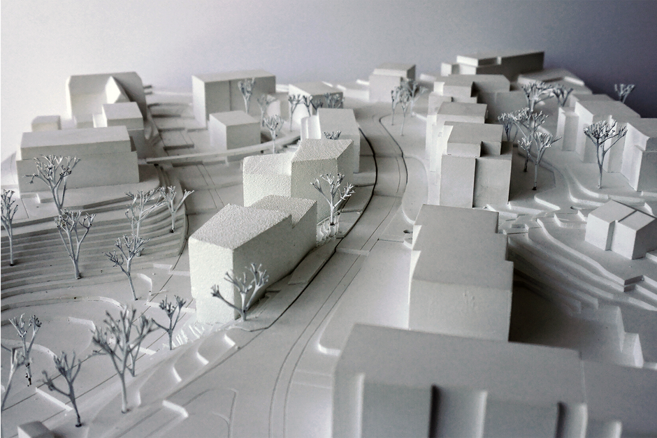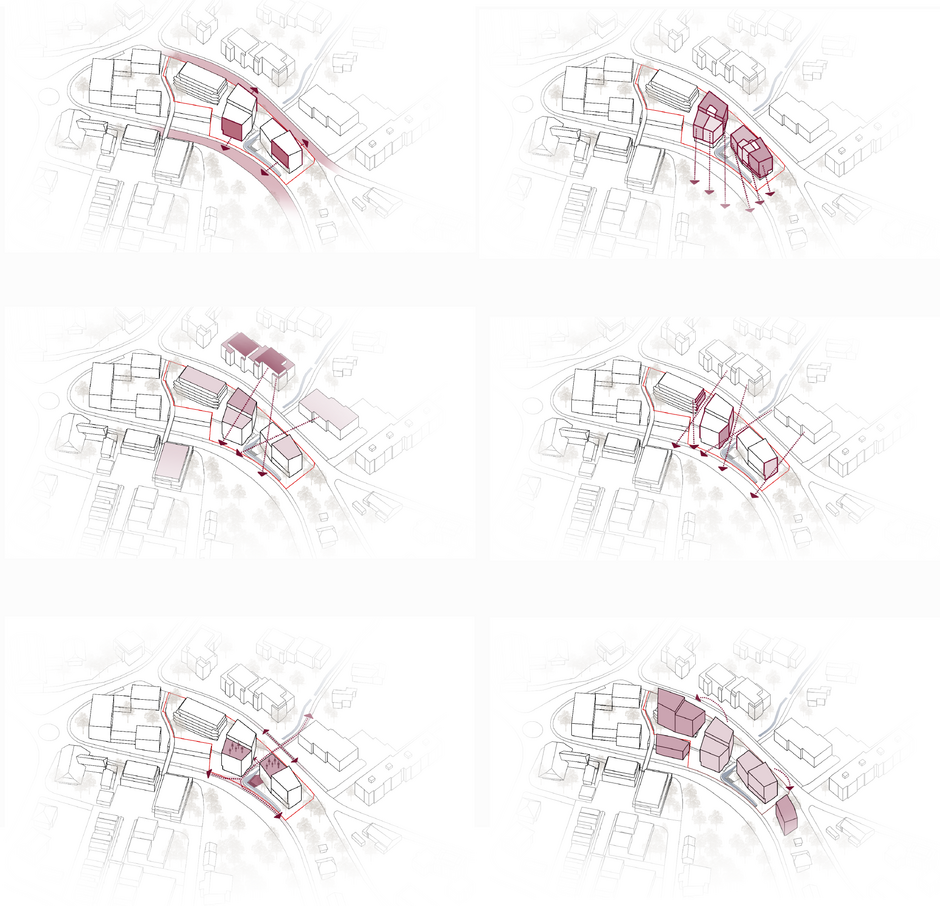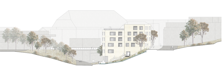 Schliesslich erlaubt es diese Formgebung, von allen Wohnungen aus vom eindrucksvollen Ausblick zu profitieren, da man an den jeweiligen, sich wegdrehenden Nachbargebäuden vorbei blicken kann. Die Grundkörper der vorgeschlagenen Gebäude beziehen sich auf die Dachkante der Zentrumsbebauung im Westen. Im Verbund mit der Stützmauer auf der gegenüberliegenden Strassenseite baut das nördliche Gebäude neu wieder ein Portal zum Zentrum von Bolligen auf.