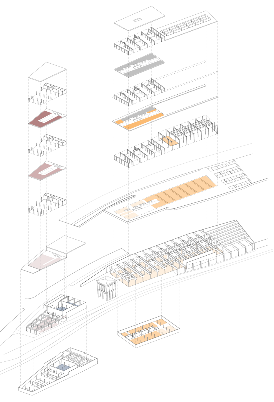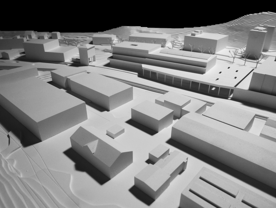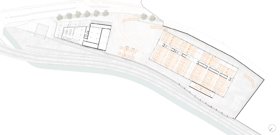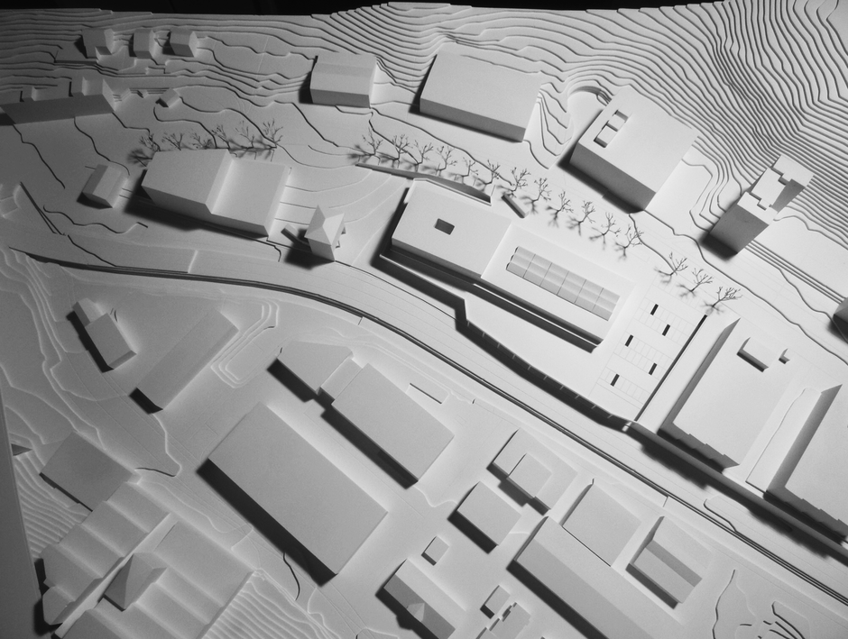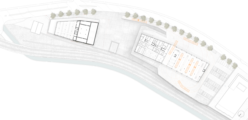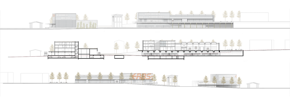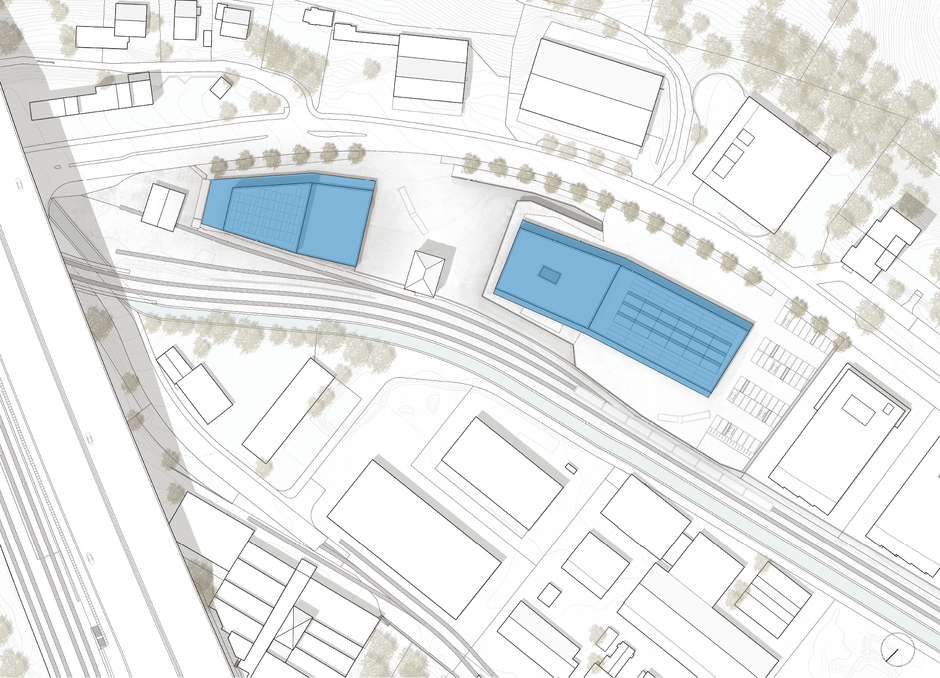 Der Bushof soll als ein für sich stehendes, eigenständiges Volumen im Osten der Parzelle situieren. Um optimale Betriebsabläufe gewährleisten zu können, werden seine Hauptfunktionen dabei gestapelt: die Einstellhalle, die kein Tageslicht braucht, auf der unteren Ebene des Grundstücks und die von oben belichteten Werkstätten zum Teil darüber. Dazwischen wird eine Plattform aufgespannt, welche ganz bewusst die von den östlichen Nachbarbauten vorgegebene Höhensituation einer Lage auf dem Niveau der Worblentalstrasse, auf dem Wettbewerbsgrundstück weiterführt. Zum Bach und zur Bahnlinie wird damit das von den Nachbargebäuden vorgegebene Thema der Sockelbauten fortgesetzt. Die Räumlichkeiten für den Fahrdienst und dessen Verwaltung sowie gegebenenfalls für eine Drittnutzung werden in dem westlichen Teil des Gebäudes auf der Plattform angeordnet. Mit seinen drei Geschossen ist dieser Gebäudeteil höher als die Werkstätten, so dass das Volumen in sich eine Gliederung erfährt. Mit ihrer Lage auf Strassenniveau erlaubt es die Plattform, die Parkplätze der Mitarbeitenden des RBS Busbetriebs und gegebenenfalls einer Drittnutzung ganz im Osten praktisch ebenerdig von der Strasse aus zu erreichen. Neben diesem Gebäude schmiegt sich ein zweites Neubauvolumen ganz im Westen bis in die Spitze des sichelförmigen Grundstücks. In dessen breiten, östlichen Gebäudeteil wird die Unterstation des BKW mit ihren drei Trafozellen untergebracht. Der Elektrodienst der RBS wird ganz im Westen in dem höheren Gebäudeteil angeordnet und profitiert somit von einer Lage unmittelbar an der Umlade-Station auf das Gleis. Trotz der, durch die Funktionen bedingten Geometrie, reagieren die vorgeschlagenen Gebäude auf den Verlauf von Bach, Bahnlinie und Strasse und mithin auf die Form des Grundstücks.