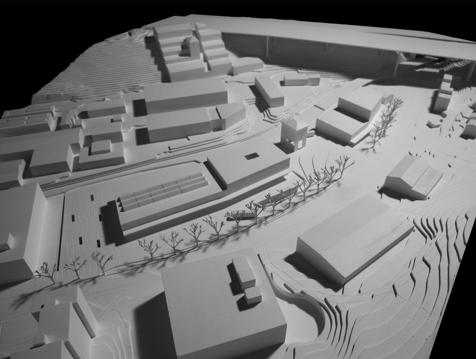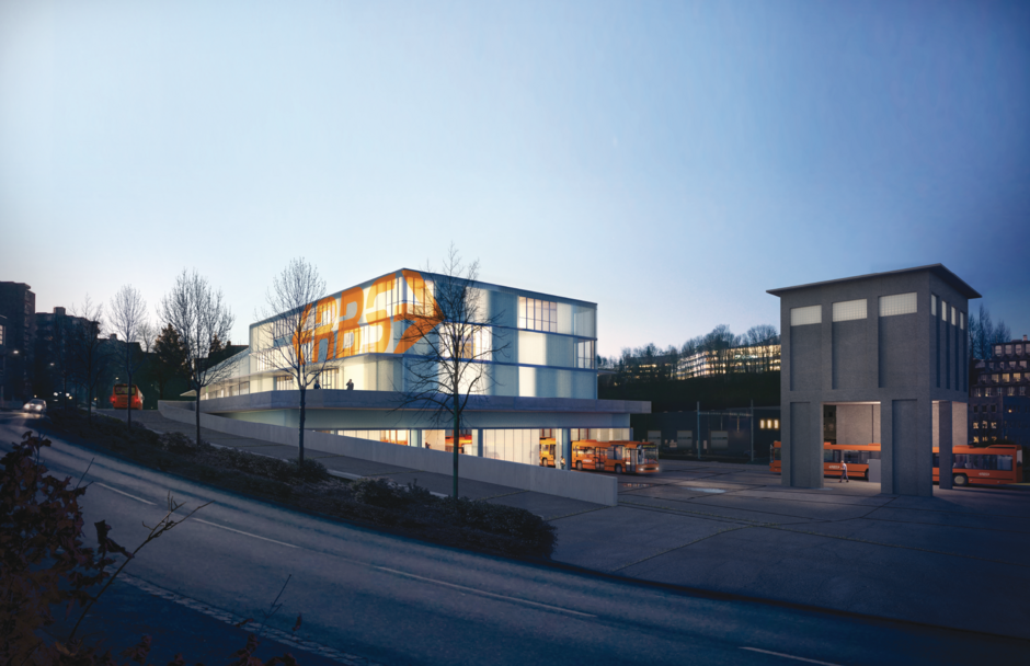 Beide Häuser sind in der Höhe gegliedert und bilden auf diese Weise Gebäudeköpfe aus. Damit korrespondieren die beiden Körper über die Ausprägung ihrer Volumen miteinander und formulieren im Ergebnis eine Gesamtanlage. Im Zentrum belassen die zwei vorgeschlagenen Neubauten Raum für einen Platz: Einen Ankunftsort für die zu deponierenden Busse und den Ausgangspunkt für den Einsatz dieser für Bern und seine Agglomeration wichtigen Verkehrsträger. Gleichzeitig werden hier die notwendigen Flächen für einen Austausch der Transformatoren und von Komponenten der Schaltanlage zur Verfügung gestellt. Hier befindet sich auch das unter Denkmalschutz stehende, ehemalige Reparaturgebäude, das in seiner Position grundsätzlich belassen, jedoch leicht gedreht wird. Es ist nicht nur eine Reminiszenz an die Vergangenheit, es wird als Dach für die Tankstelle vielmehr zu einem wichtigen Bestandteil.