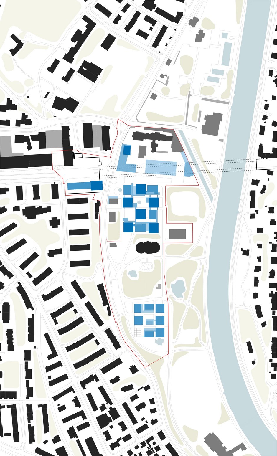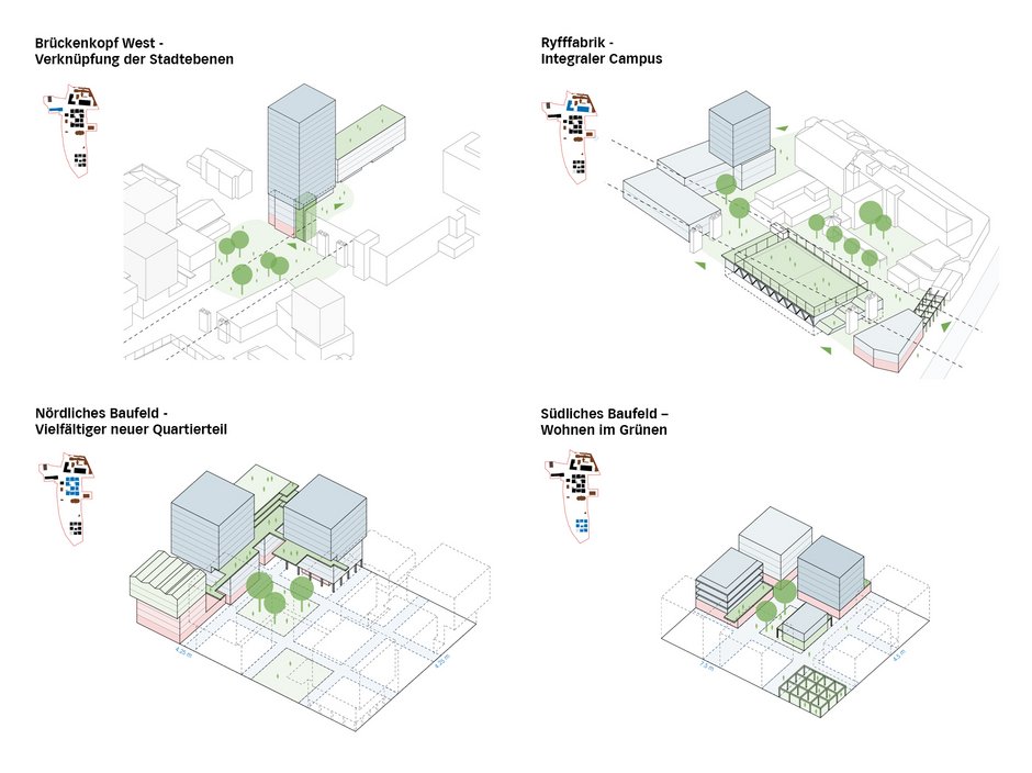 Während die Ryff-Fabrik im Norden wieder zu einem integralen Campus vervollständigt wird, der sich der trennenden Wirkung der Monbijoubrücke durch „Unterbrückung" entgegenstellt, entstehen südlich davon zwei verwandte, in Umfang und Körnung differenzierte Neubaucluster.