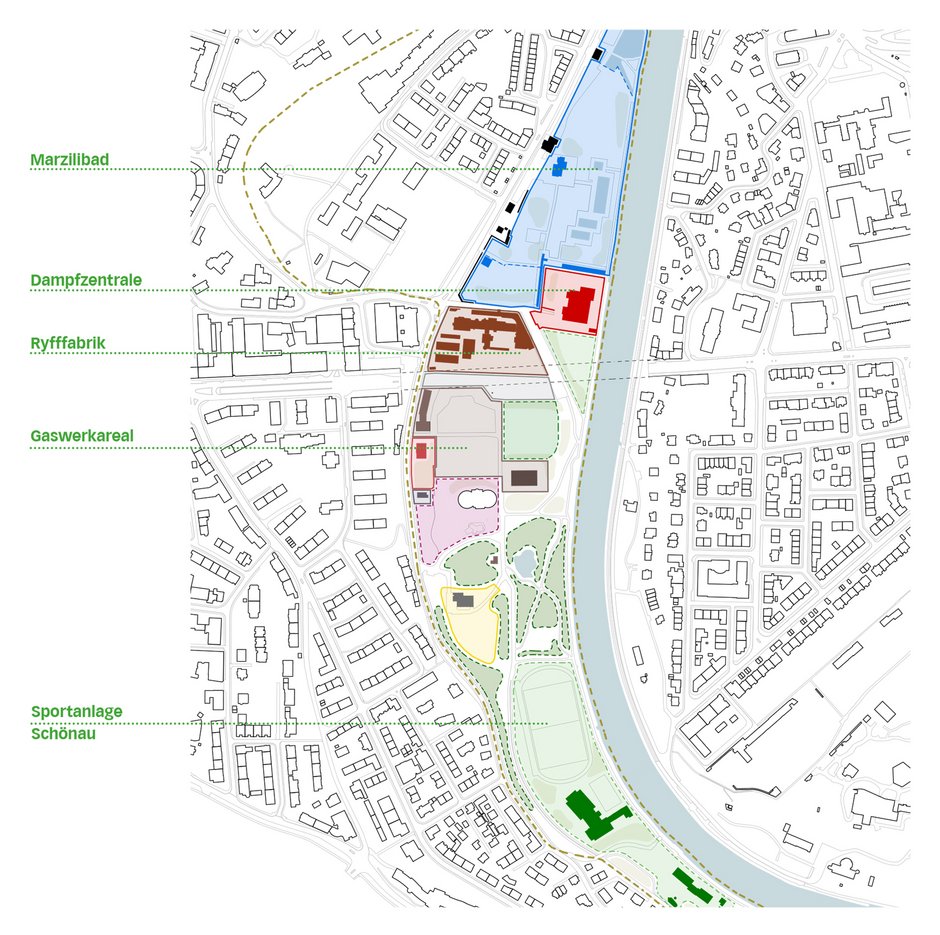 Insgesamt wird mit dem Vorschlag eine schlüssige Strategie von hoher Präzision aufgezeigt, die gleichzeitig viel interpretativen Spielraum für eine lebendige Umsetzung offen lässt. Sie ist in der Lage, den drei dichten baulichen Clustern in der grünen „Wildnis" der Schwemmlandebene eine je hohe Identität zu schenken, fördert aber auch einen über das ganze Areal durchgehenden, wahrnehmbaren Gesamtzusammenhang. Auf selbstverständliche Weise werden auch die freistehenden Bestandesbauten des Gaswerkareals in den fliessenden Grünraum eingebettet.