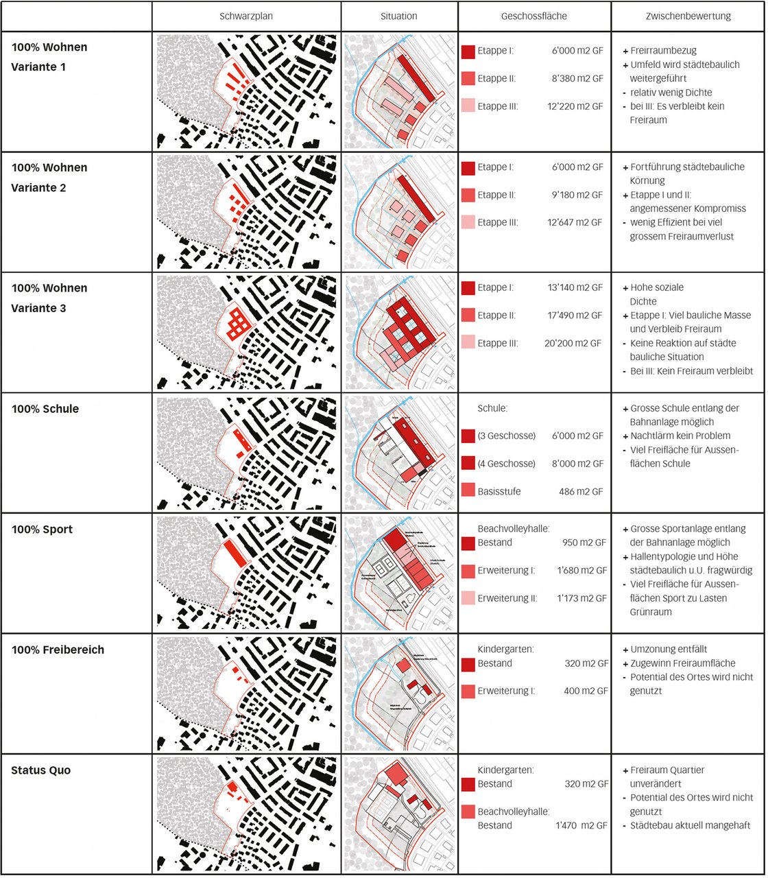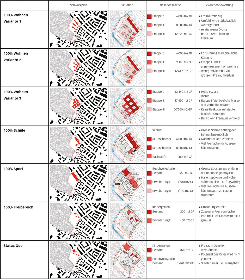 Die Gegenüberstellung und Bewertung der unterschiedlichen Nutzungsmöglichkeiten und die begleitende Untersuchung der Goumoënsmatte in Bezug auf Geometrie, Baukörper und Masse führte schliesslich zu einer beschränkten Anzahl an Nutzungen und Nutzungskombinationen: Es verbleiben fünf mögliche Szenarien mit den Schwerpunkten Wohnen, Schule und Beachvolleyball.