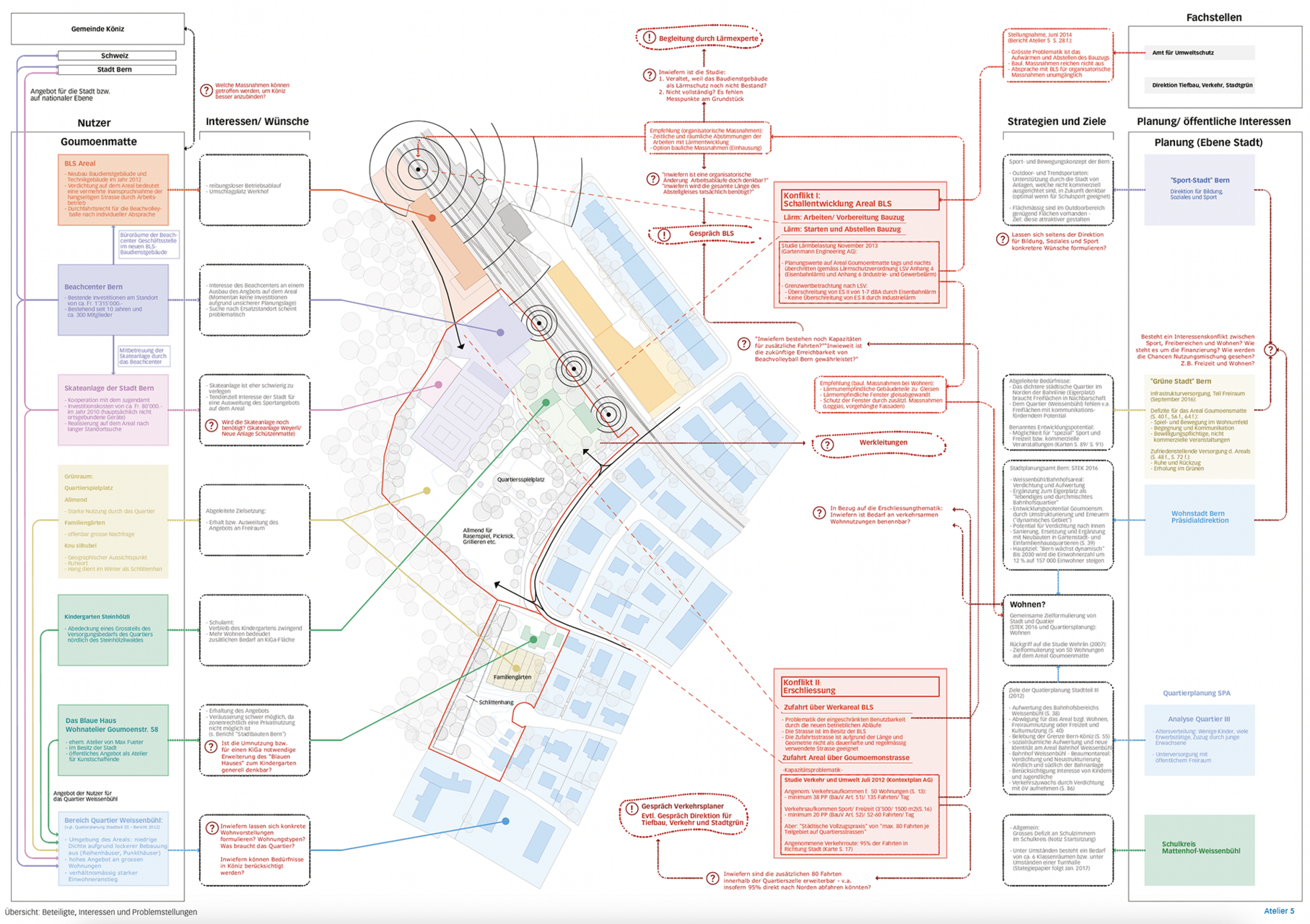 Die komplexe Situation erfordert eine genaue Abklärung der Interessen der Beteiligten und Nutzer. Abgestimmt werden müssen das öffentliche Interesse an Wohnraum, Bildung bzw. Freizeit - vertreten durch die Ämter- und die Interessen der beteiligten Nutzer auf und um das Areal. Wichtige Beteiligte bei der Entwicklung waren deshalb insbesondere die BLS und Beachvolleyball Bern.