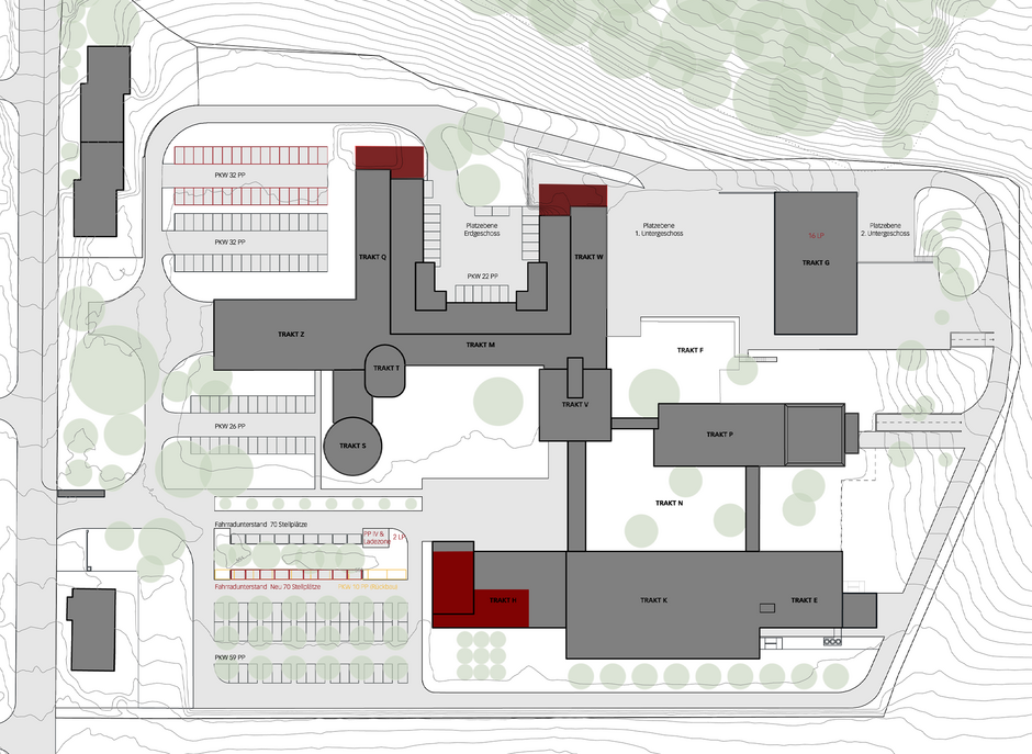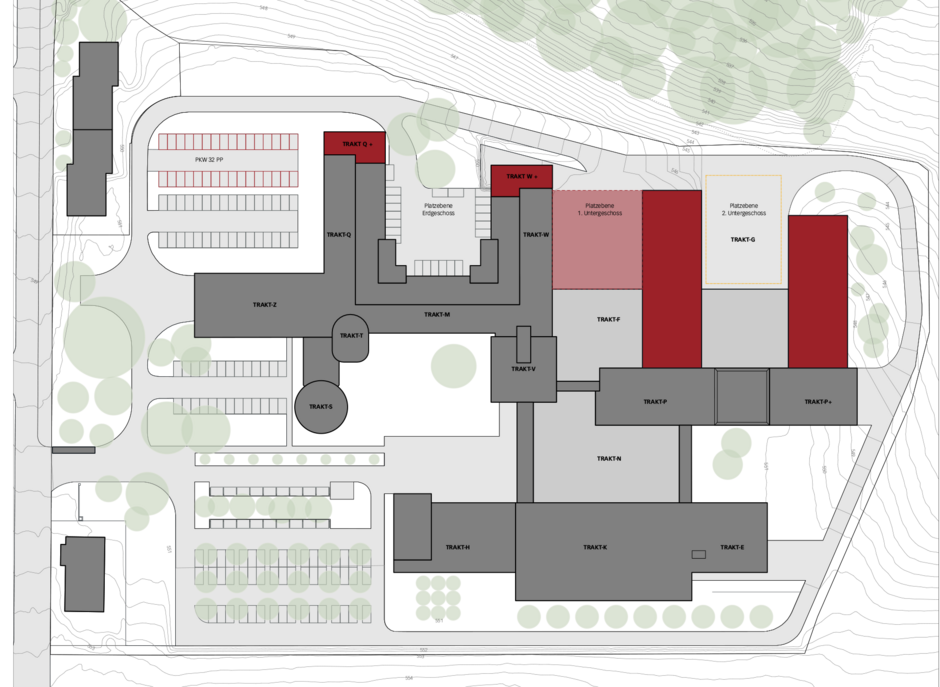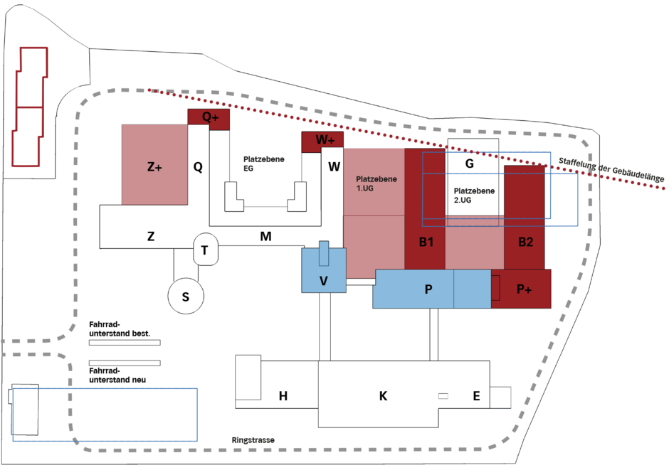 Der Masterplan 2055 soll das "maximale" Ausbaupotenzial ausloten und ein übergeordnetes städtebauliches Konzept für die Verdichtung des Areals definieren. Die kammförmige Struktur des Altbaus wird weitergezogen und bildet mit den neuen Gebäudearmen, eine neue Einheit.