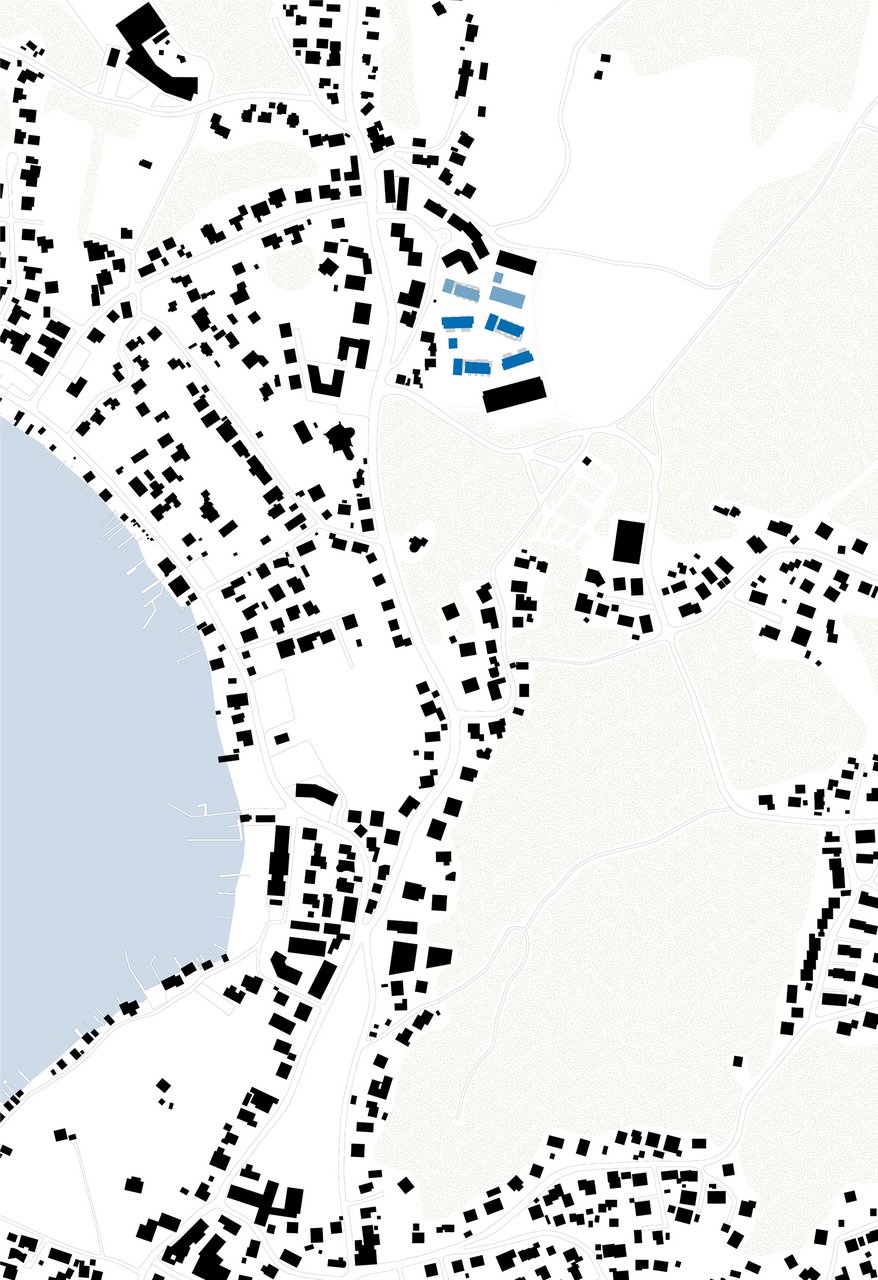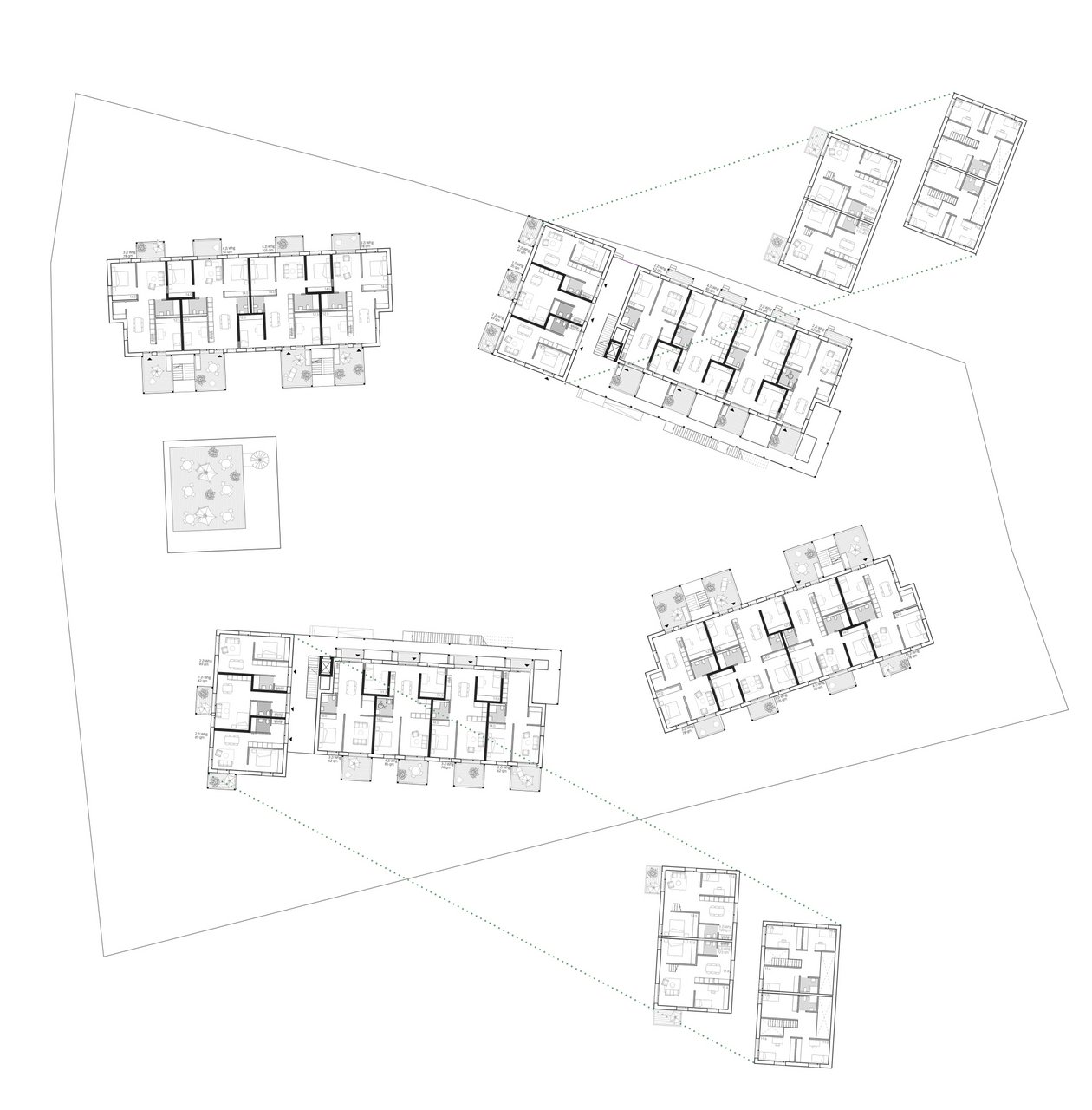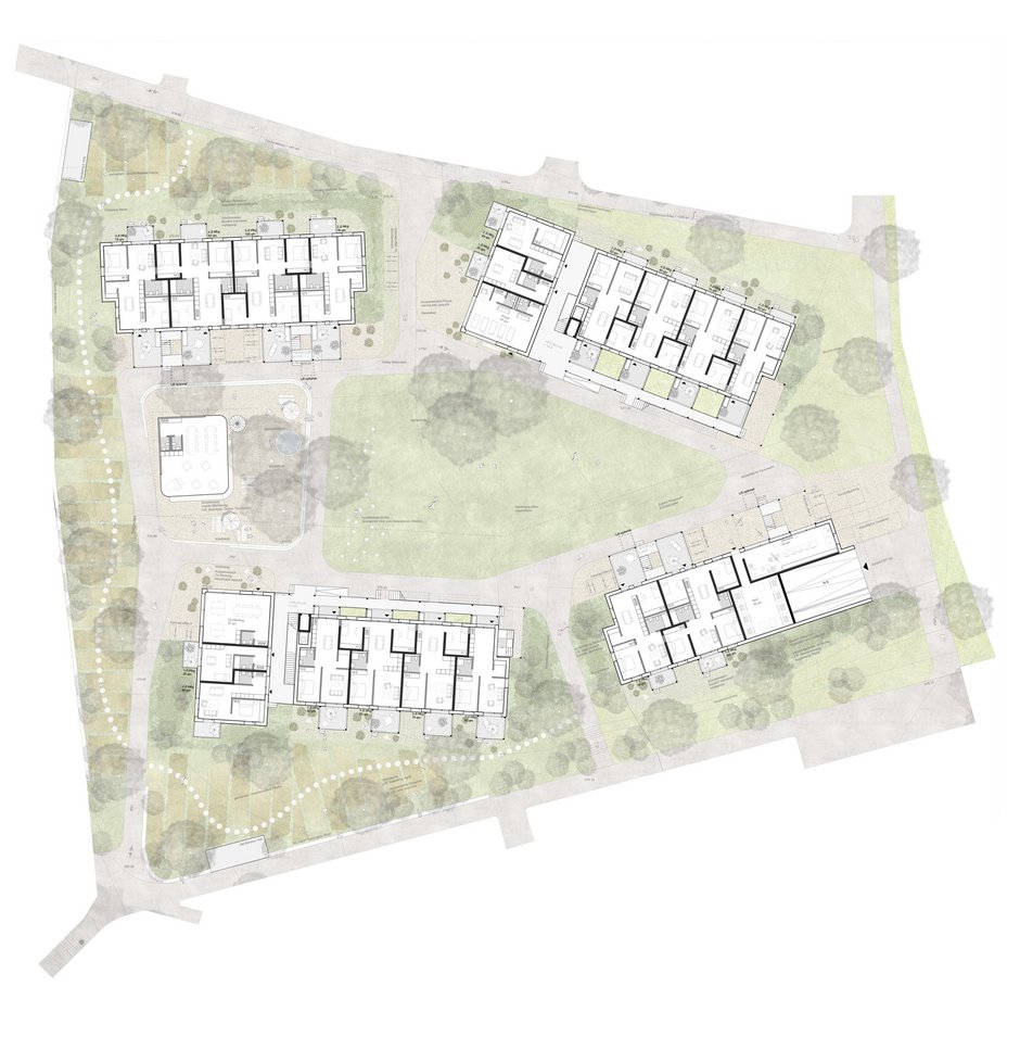Der Wettbewerbsvorschlag setzt auf dem sich von Westen nach Osten verjüngenden Wettbewerbsgebiet zwischen einem mächtigen, kurz vor der Realisierung stehende Supermarkt und einer bestehenden Kinderkrippe drei sich auffächernde, aus jeweils zwei Volumen bestehende Gebäudezeilen. Diese werden in sich so geknickt, dass sie gut nutzbare Außenräume mit einer klaren Zeichensetzung formen. Auf diese Weise umfassen die vier Wohngebäude der Genossenschaft Wogeno einen großzügigen Hof. Dieser Aussenraum im Zentrum der genossenschaftlichen Wohnanlage hat die Form einer zweiseitig offenen Raute. Er ist das kommunikative Zentrum, ein Begegnungsort mit Spielflächen und Aufenthaltsbereichen, zu dem sich alle halböffentlichen Nutzungen für die Bewohnenden hin orientieren.
